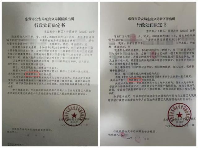 郭女士向记者提供了两份行政处罚决定书,其中一份显示,2025年2月26日19时许,张某某因孩子与郭女士儿子打架,领着自己的两个孩子到刘家理论,过程中与刘某某的姐姐小莹发生争执,双方撕打在一起。经鉴定,小莹为轻微伤。张某某殴打他人的违法行为成立,根据《治安管理处罚法》,决定给予张某某罚款肆佰元的行政处罚。