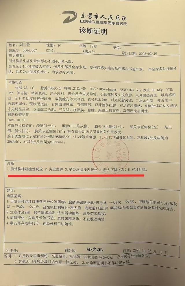 郭女士说,小莹到医院被诊断为:脑外伤神经症性反应、头皮血肿、多处皮肤浅表挫伤、听力下降(右)、右耳耳鸣。“尤其是耳朵问题,经鉴定损伤程度为轻微伤。”